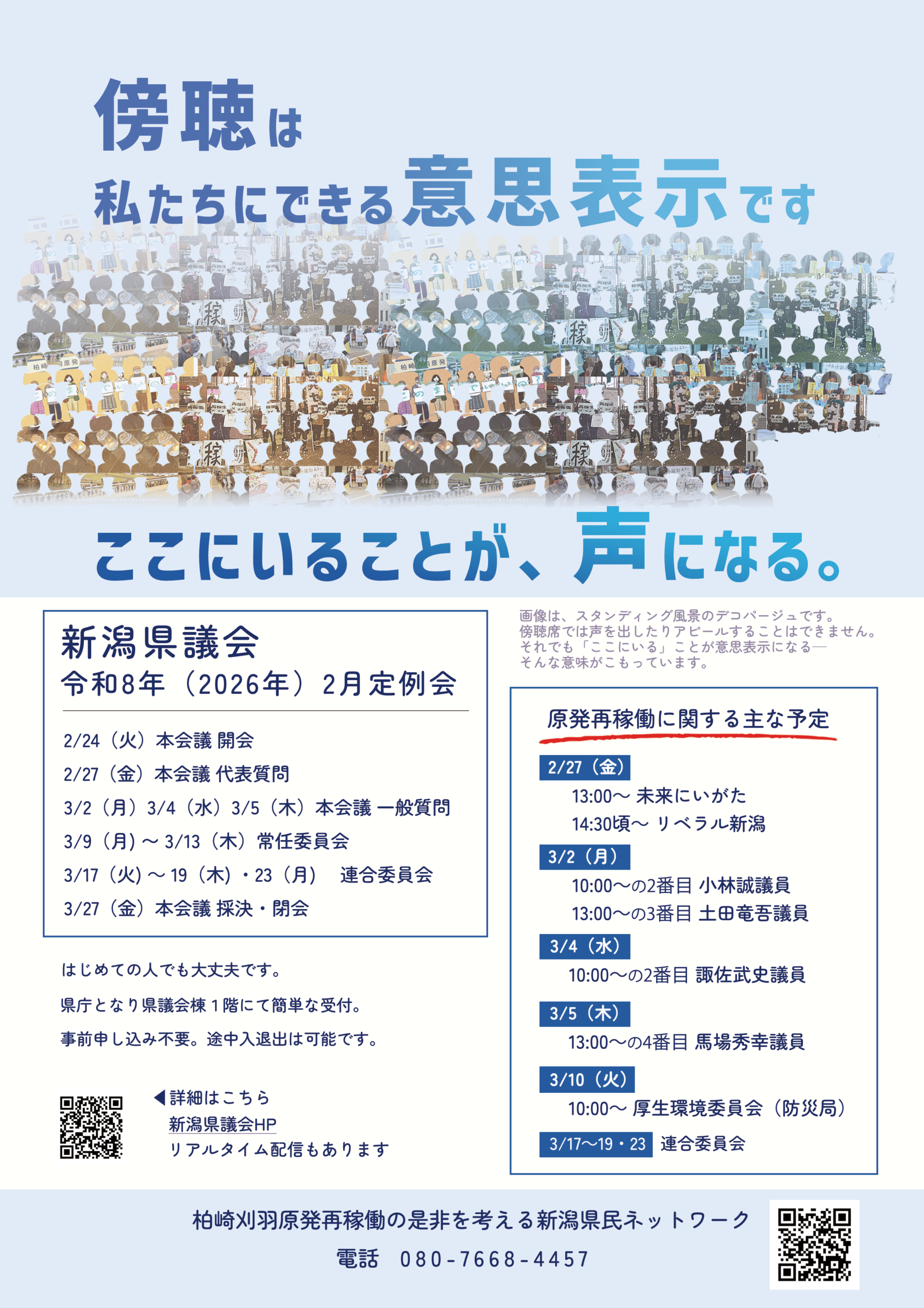 新潟県議会(2月定例会)の傍聴を呼びかけます。