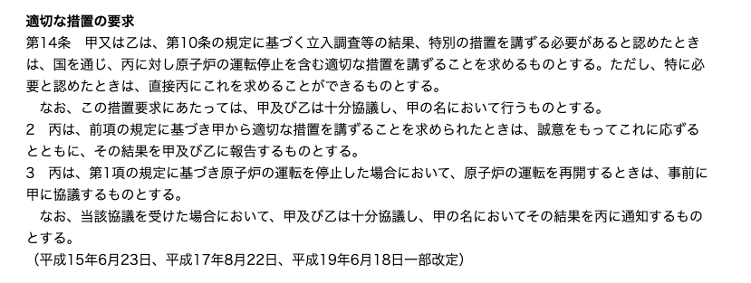 この中には、原発施設・関連施設の新増設に関する事前了解(第3条)、周辺の環境放射線値の異常や特に必要と認める場合の立ち入り調査(10条)などに加え、同立ち入り調査等の結果を踏まえた適切な措置の要求(14条)などの条項があります。