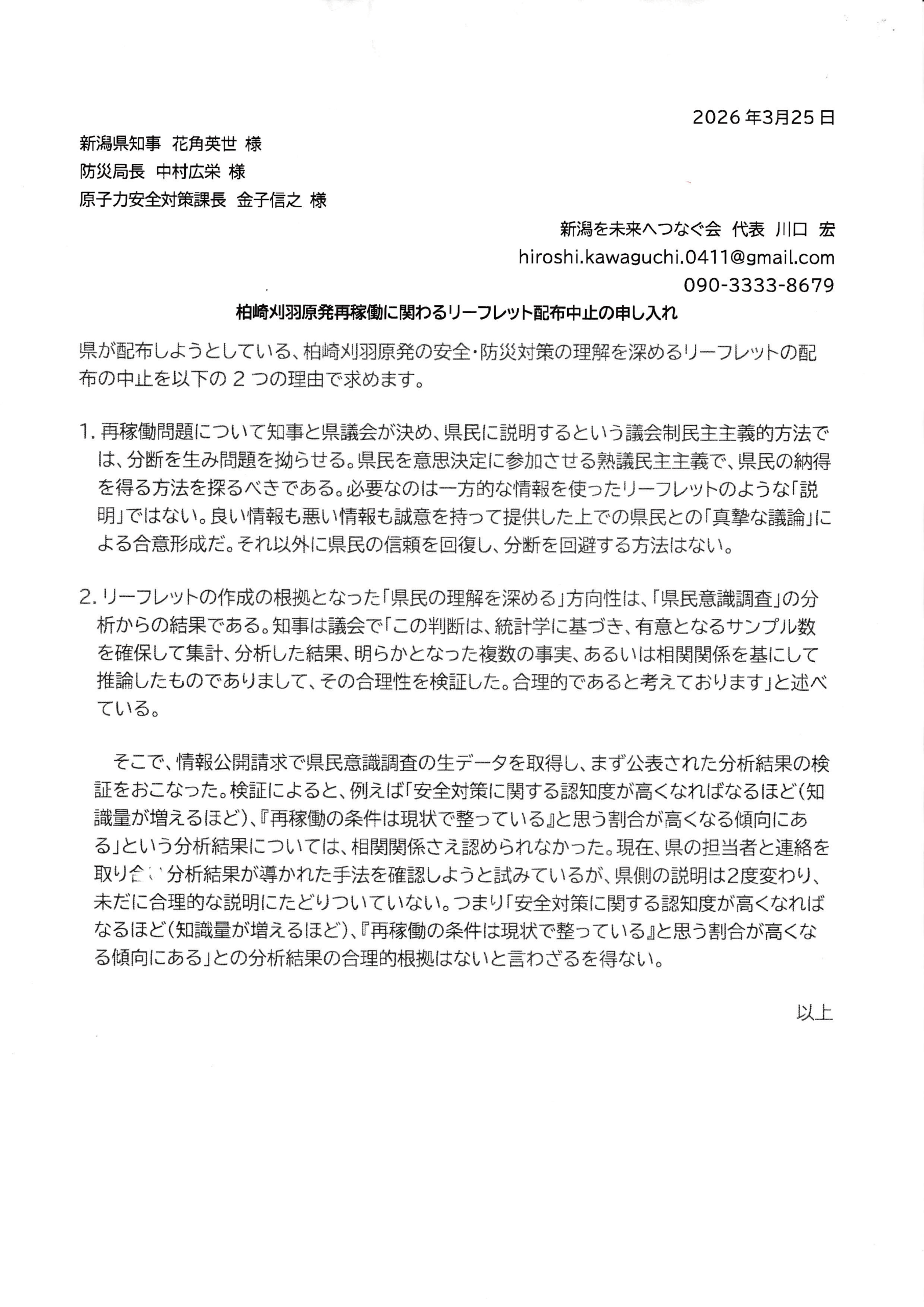 PDF版はこちら▶柏崎刈羽原発再稼働に関わるリーフレツト配布中止の申し入れ